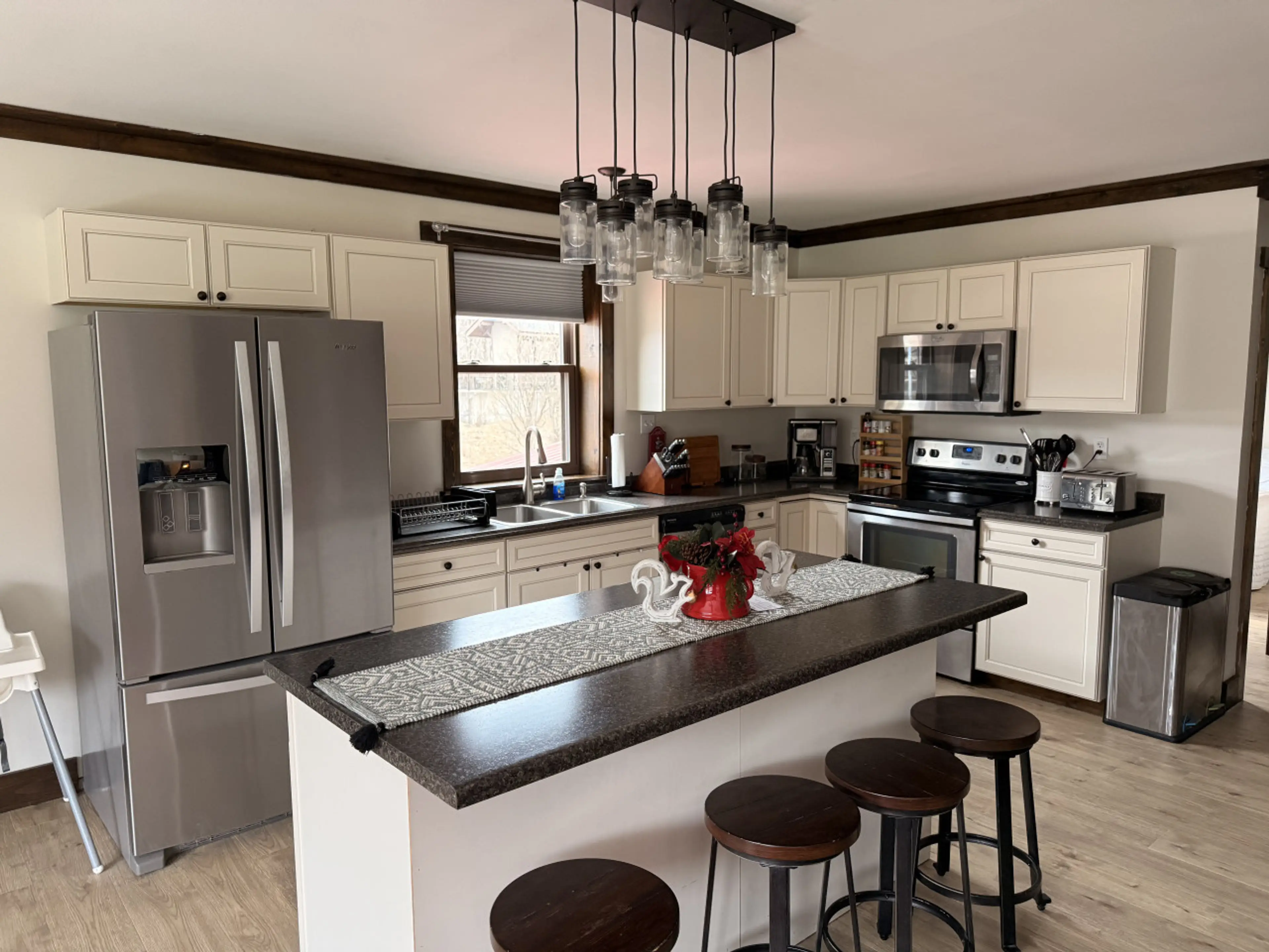Walking distance to where your bike or rafting adventure with Wilderness Voyagers begins. Just bring earplugs as location is next to train tracks. Third bedroom has no windows, but that didn’t bother us. For cleanliness and location, this was a great choice for our group. We really enjoyed the large living room and kitchen!